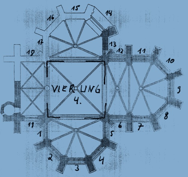 Spekulation aber wäre ob die jeweilige Länge der Vierung um  8,60 so rum der 87 entspricht, dem Jahr. Bestimmt aber konnten die Baumeister nicht ahnen, was erst die Absurdität der Geschichte baut und schaft, das sich die 12 des Jahrhunderts in den noch jetzt 12 übrig gebliebenen hohen Fenstern spiegelt.