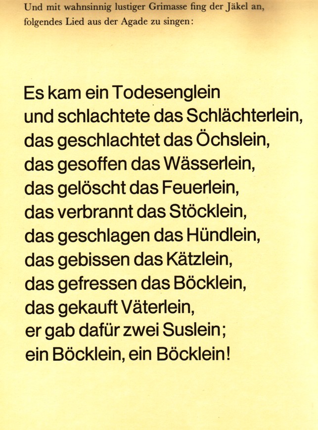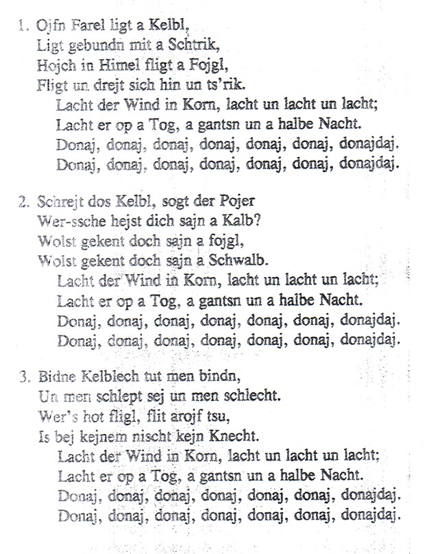 Dieses Lied, genauer seine Melodie, ist wohl durch den Gesang von Donavan unter dem Titel »Dona, Dona« das bekannteste jüdische Lied in Deutschland. Aber wer weiß schon, daß es aus dem jüdischen Ghetto in Warschau stammt?